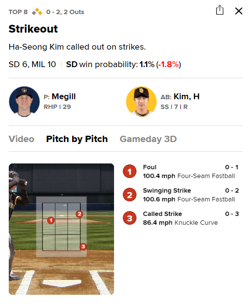 그러나 판정은 삼진이었다. MLB 공식 홈페이지 MLB닷컴의 게임데이에 따르면 이 공은 존 바깥 쪽에 아주 살짝 걸친 것으로 나오는데 김하성은 볼이라는 판단으로 방망이를 내지 않았고 이후 억울해하며 주심에게 항의의 뜻을 나타내는 이례적인 장면도 연출했다.