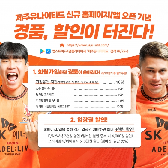 [스포탈코리아] 한재현 기자= 제주유나이티드가 신규 홈페이지/앱과 티켓 예매 오픈를 기념해 회원가입자 및 입장권 구매자에게 풍성한 혜택을 제공한다.
