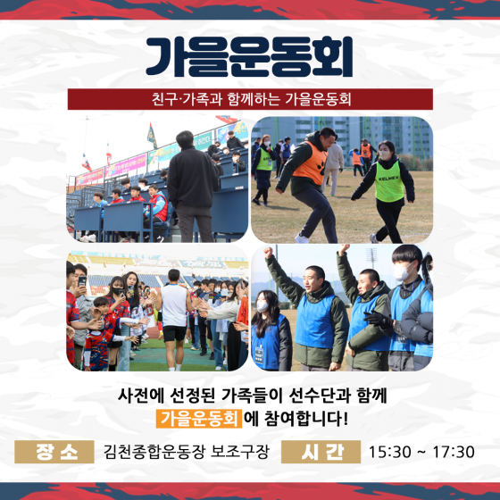 김천은 경기 시작 전 사전 모집자를 대상으로 가을운동회 사전 행사를 진행한다. 가을운동회 사전 행사는 스타디움 투어, 레크레이션, 선수와 함께하는 축구클리닉, 팬사인회 등이 포함돼있다.
