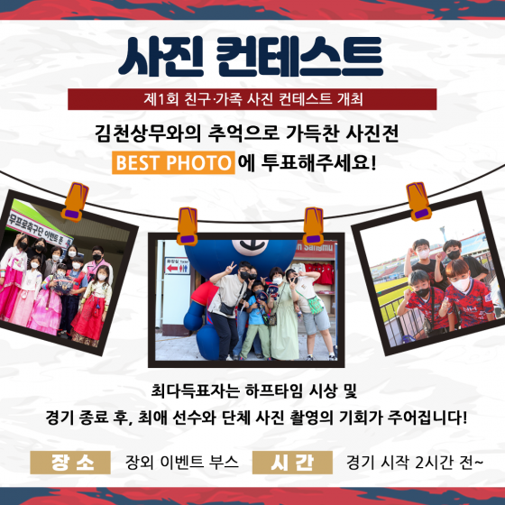 제1회 친구, 가족사진 컨테스트도 진행한다. 사전 제출한 김천상무와 관련된 사진을 대상으로 투표를 실시하며 하프타임에 최다득표자 시상을 진행한다. 최다득표자에게는 사진 액자와 트로피를 증정하며 최애 선수와 단체 가족사진 촬영 기회를 부여한다.