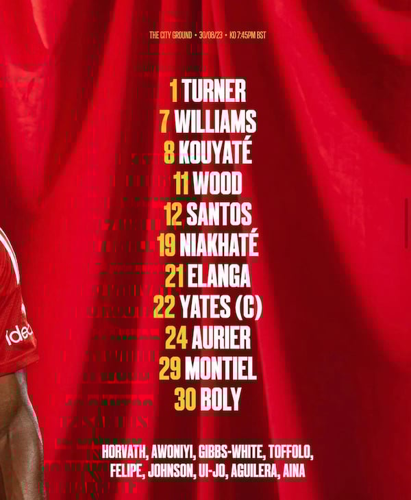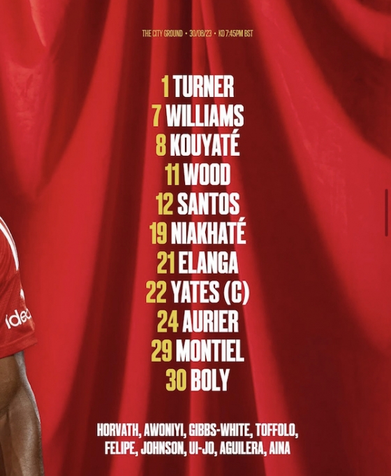 노팅엄은 3-4-2-1 포메이션을 꺼냈다. 최전방에 크리스 우드를 필두로 좌우에 안드레이 산토스와 안토니 엘랑가가 출격했다. 중원에 니코 윌리엄스-라이언 예이츠-니코-체이쿠 쿠야테-곤살로 몬티엘이 나왔다.