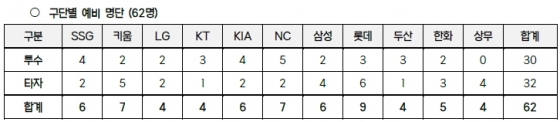 투수가 30명, 야수는 32명이 엔트리에 이름을 올렸다. 지난 1회 대회에서는 예비 엔트리가 42명에 불과했지만, 이번 대회에서는 20명이 늘어난 62명으로 구성했다.