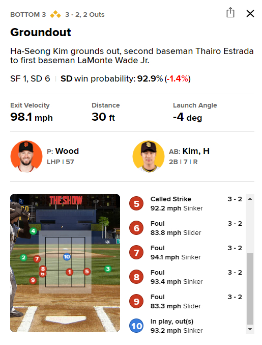 샌디에이고는 3회에도 2사 후에 득점을 가동하기 시작했고 벡을 강판시켰다. 팀이 6-1까지 앞서간 3회말 2사 만루에 김하성이 다시 타석에 들어섰다. 스리쿼터 유형의 투수 알렉스 우드를 상대로 볼 카운트 3-1에서 5구 싱커가 존 바깥 쪽으로 향했고 김하성은 볼넷을 확신한 듯 1루로 걸어나가려는 제스처를 취했다.