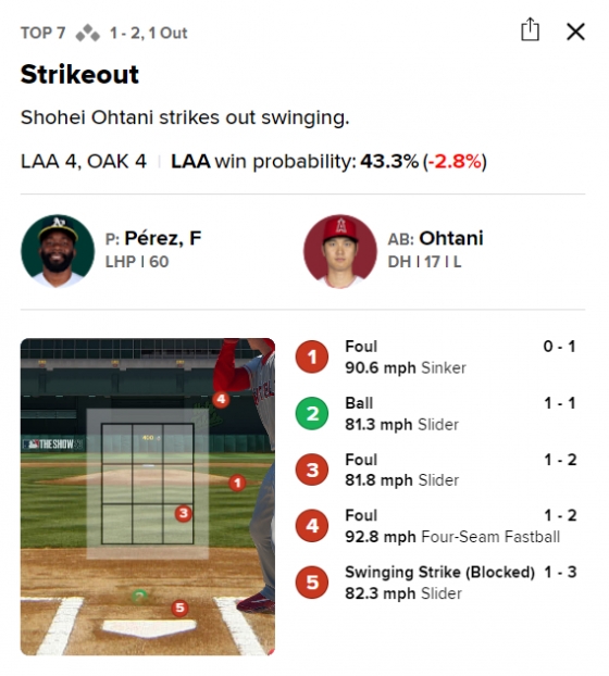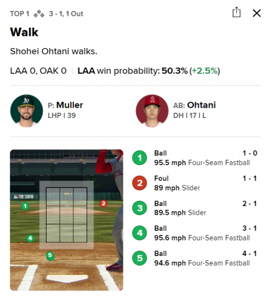 3회 오타니는 1루수 뜬공으로 물러났다. 그러나 이 때도 유리한 카운트를 잡은 뮬러의 유인구는 존을 크게 벗어난 것을 확인할 수 있다. 5회 바뀐 투수 아드리안 마르티네스를 상대로 두 번째 볼넷을 얻어냈다. 이 때도 5구 만에 걸어 나갔는데 오타니가 헛스윙한 2구 체인지업도 존 밑으로 떨어지는 공이었다.