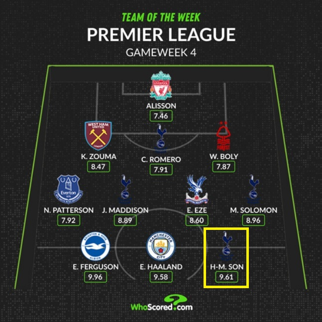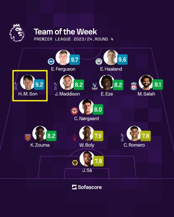 EPL 사무국은 5일(한국시간) 공식 SNS에 "해트트릭 영웅 3명이 포함된 최전방이다. 앨런 시어러의 이주의 팀에 대해 어떻게 생각하나요?"라며 손흥민이 포함된 4라운드 베스트 11을 공개했다.