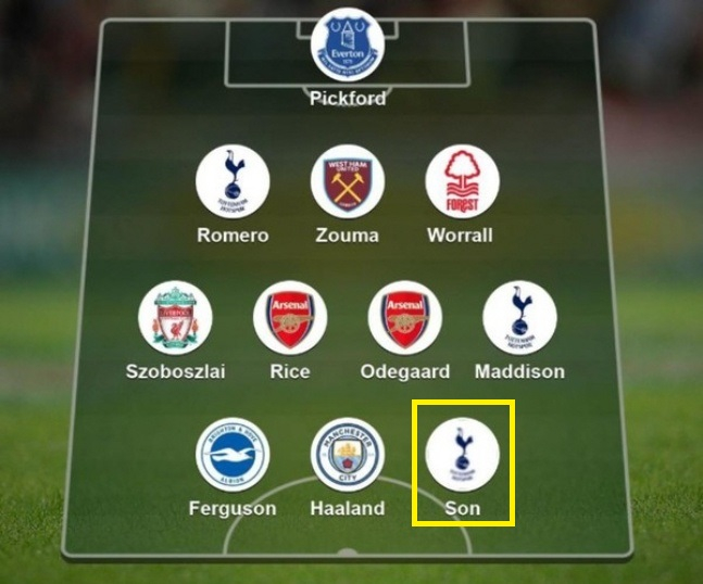 손흥민은 엘링 홀란드(맨체스터 시티), 에반 퍼거슨(브라이튼 앤 호브 알비온)과 함께 스리톱을 이뤘으며, 루카스 파케타(웨스트햄)-데클란 라이스(아스널)-빌리 길모어(브라이튼 앤 호브 알비온)-제임스 매디슨(토트넘)이 미드필드진을 이뤘다. 후방에는 조 고메즈(리버풀)-월리 볼리-조 워럴(이상 노팅엄 포레스트)가 스리백으로 포진, 조던 픽포드(에버튼)이 골문을 지켰다.