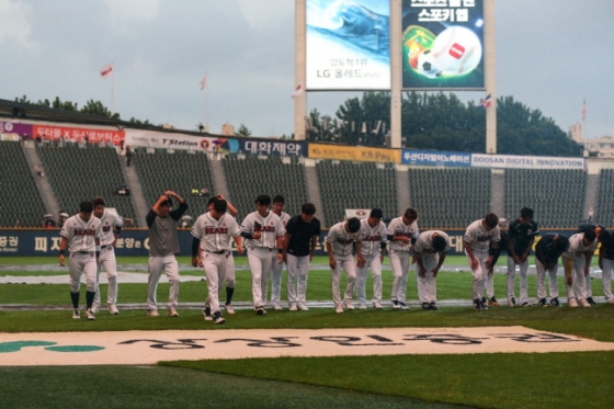 당초 5일 우천취소를 예상하기 힘들었지만 잠실 하늘에 갑자기 먹구름이 드리웠다. 세찬 비가 쏟아졌고 결국 오후 6시 55분 취소가 선언됐다. 정수빈과 양석환, 허경민이 경기장을 찾은 팬들을 위해 우천 세리머니를 했고 이를 지켜본 팬들도 아쉬움을 달래며 발길을 돌렸다.