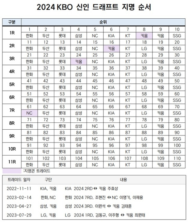 키움 외에도 NC가 한화의 7라운드 지명권을 확보하면서 전 구단이 모든 지명권을 행사할 경우, 키움은 14명, NC는 12명, LG, KIA, 삼성, 한화는 10명, 그 외 구단들은 11명의 선수를 지명하게 돼 총 110명의 선수가 KBO 리그 구단 유니폼을 입게 된다.