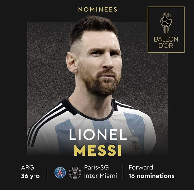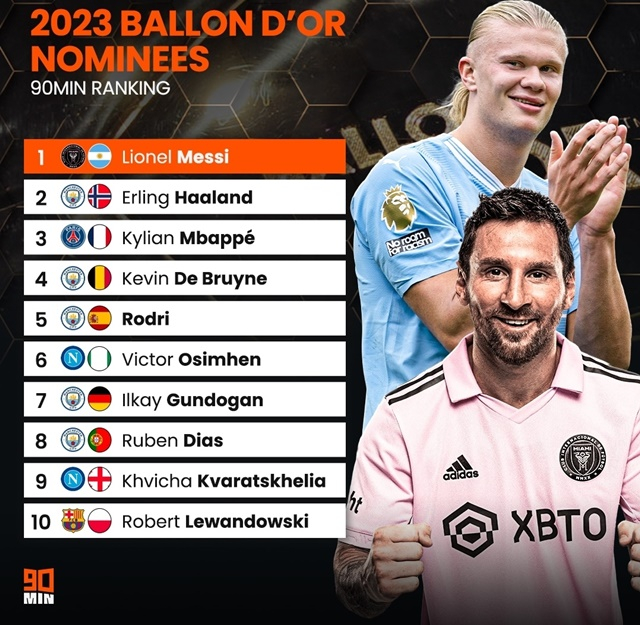 한편 매체는 'GOAT' 리오넬 메시(인터 마이애미)가 발롱도르를 수상할 것이라고 내다봤다. 예상 순위 1위에 올려놓았다. 메시의 경우 역대 8번째 수상에 도전한다. 이미 역대 최고 7번 수상을 차지했다. 올해 메시가 발롱도르를 품에 안는다면, 유럽이 아닌 다른 리그에서 뛰는 선수가 발롱도르에 오르는 첫 번째 사례가 된다. 2위는 프리미어리그, 유럽챔피언스리그 득점왕을 차지하며 맨시티의 유럽 트레블을 이끈 엘링 홀란드였다. 3위는 '이강인 동료' 킬리안 음바페(PSG)가 이름을 올렸다.