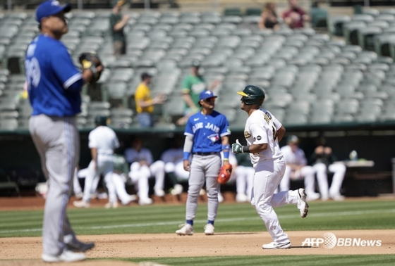 류현진(왼쪽)이 7일(한국시간) 오클랜드전 4회 카를로스 페레스에게 홈런을 맞은 뒤 어딘가를 응시하고 있다. /AFPBBNews=뉴스1