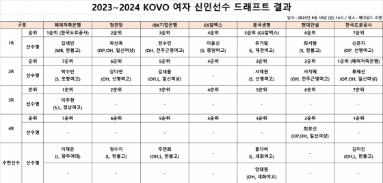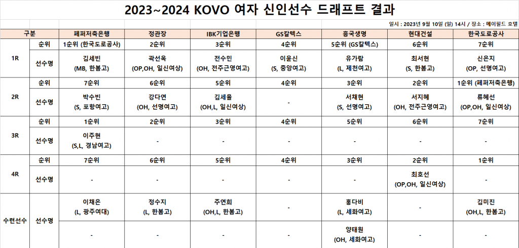 한국도로공사로서는 행운이었다. 구슬 추첨 결과 페퍼저축은행(검정·35개)-정관장(빨강·8개)-IBK기업은행(파랑·30개)-GS칼텍스(초록·20개)-흥국생명(노랑·2개)-현대건설(분홍·4개)-한국도로공사(하양·1개) 순으로 나왔다. 지명권 트레이드를 반영한 실제 1라운드 지명은 한국도로공사(페퍼저축은행 1R)-정관장-IBK기업은행-GS칼텍스-GS칼텍스(흥국생명 1R)-현대건설-한국도로공사가 됐고, 한국도로공사는 김세빈을 지명했다.