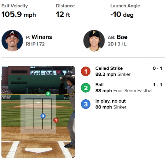 배지환은 팀이 2-5로 뒤진 8회초 선두타자로 네 번째 타석에 섰다. 애틀랜타 투수는 A.J. 민터. 배지환은 초구 높은 존에 스트라이크 판정을 받은 뒤 2구째 바깥쪽으로 빠진 공과 3구째 역시 바깥쪽 높은 공을 잘 골라냈다. 4구째는 바깥쪽 존에 절묘하게 걸친 스트라이크. 5구째 96.2마일(154.7㎞) 강속구에 백네트 쪽으로 파울을 기록한 뒤 6구째 높은 볼도 잘 골라냈다. 하지만 7구째 바깥쪽 높은 코스로 파고든 95.5마일(153.7㎞) 속구에 배트가 뒤늦게 돌아가며 헛스윙 삼진으로 고개를 숙였다.