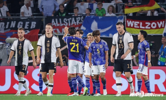 일본전 패배에 실망하는 독일 대표팀(흰색 유니폼). /AFPBBNews=뉴스1