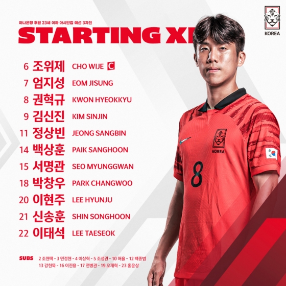 이날 한국은 카타르와 1차전 및 키르기스스탄과 2차전처럼 4-3-3 대형으로 나섰다. 김신진(FC서울)이 최전방 스트라이커에 배치된 가운데, 엄지성(광주FC)과 정상빈(미네소타FC)이 양쪽 측면에서 윙어로 팀 공격을 이끌었다. 이현주(베헨비스바덴)와 백상훈(FC서울)이 공격형 미드필더로 중원에서 공격을 지원했으며, 권혁규(셀틱FC)가 수비형 미드필더로 나서 공수를 조율했다. 이태석(FC서울), 서명관(부천FC), 조위제(부산아이파크), 박창우(전북현대)가 포백 라인을 구축했으며, 신송훈(김천상무)이 골키퍼 장갑을 꼈다.