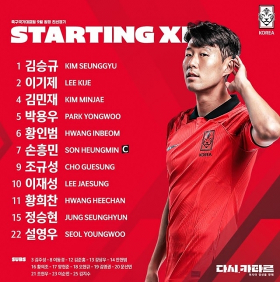 이날 클린스만 감독은 4-4-2 포메이션을 꺼내들었다. '캡틴' 손흥민(토트넘)과 조규성(미트윌란)이 투톱으로 나섰고, 황희찬(울버햄튼)과 황인범(즈베즈다), 박용우(알아인), 이재성(마인츠)이 뒤를 받쳤다. 포백은 이기제(수원삼성), 김민재(바이에른 뮌헨), 정승현, 설영우(이상 울산현대), 골키퍼는 김승규(알샤밥)였다. 지난 웨일스전과 비교해 한 자리만 바뀌었다. '황선홍호' 아시안게임 대표팀에 합류한 홍현석(KAA헨트) 대신 황희찬이 선발 기회를 얻었다.