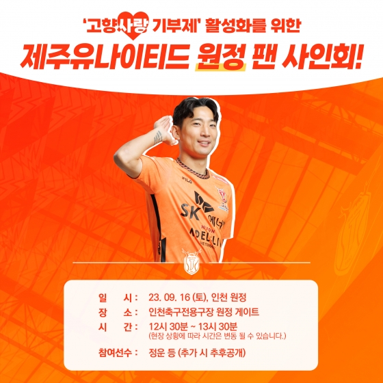 제주는 오는 16일 오후 2시 인천전용축구경기장에서 열리는 하나원큐 K리그1 2023 30라운드 원정경기에서 제주특별자치도(오영훈 도지사 외 20여명)와 제주특별자치도 재외도민회 100여명이 참여하는 가운데 제주사랑기부제 홍보를 위한 참여 행사를 연다.