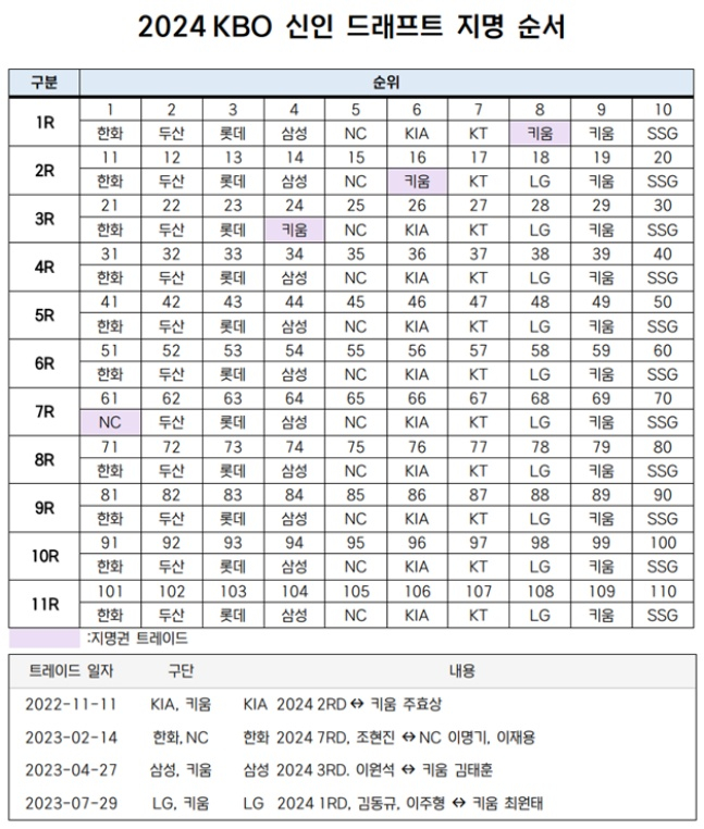 올해도 그 기조를 이어갈지가 관심 포인트다. 2023시즌을 리그 최하위로 마칠 것이 유력한 키움은 2024시즌 새로운 도전에 나서게 된다. 이정후가 발목 인대 수술로 시즌 아웃되긴 했으나, 포스팅 시스템을 통해 메이저리그 진출이 유력하고, 에이스 안우진은 팔꿈치 인대 접합 수술(토미 존 서저리)로 2024시즌을 뛰지 못하는 것은 확정적이다. 여기에 또 다른 핵심 김혜성의 포스팅 및 FA도 얼마 남지 않은 상황이라 투·타 가릴 것 없이 양질의 유망주 확보가 필수다. 키움은 이번 드래프트 풀이 최근 몇 년 새 가장 준수하다는 평가를 믿고 공격적으로 상위 지명권을 확보했다. 그 지명권으로 또 한 번 깜짝픽을 선보일지, 그 순간 최고의 기량을 가진 유망주를 선택할지 키움의 행보에 관심이 쏠린다.