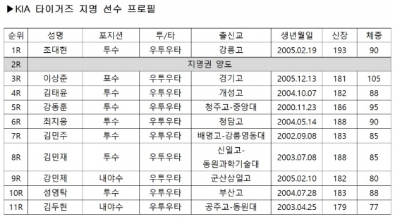 이날 지명을 마친 권윤민 KIA 전력기획팀장은 "신체조건이 뛰어나고 빠른 공을 던지는 유형과 경기 운영 능력이 뛰어난 유형을 고르게 지명했다"며 "야수는 공격력과 장타력에 강점을 보인 선수를 지명해 미래전력에 큰 도움이 될 것"이라고 설명했다.