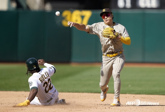 김하성은 경기 막판 멋진 수비를 펼치며 투수의 어깨를 가볍게 했다. 5-2로 리드하던 9회 말 1사 1루, 마무리 헤이더가 앨런에게 중견수 쪽으로 빠져나갈 것 같은 타구를 허용했다. 하지만 길목에서 이를 차단한 김하성은 곧바로 유격수 보가츠에게 글러브 토스를 하며 1루 주자를 아웃시켰다.