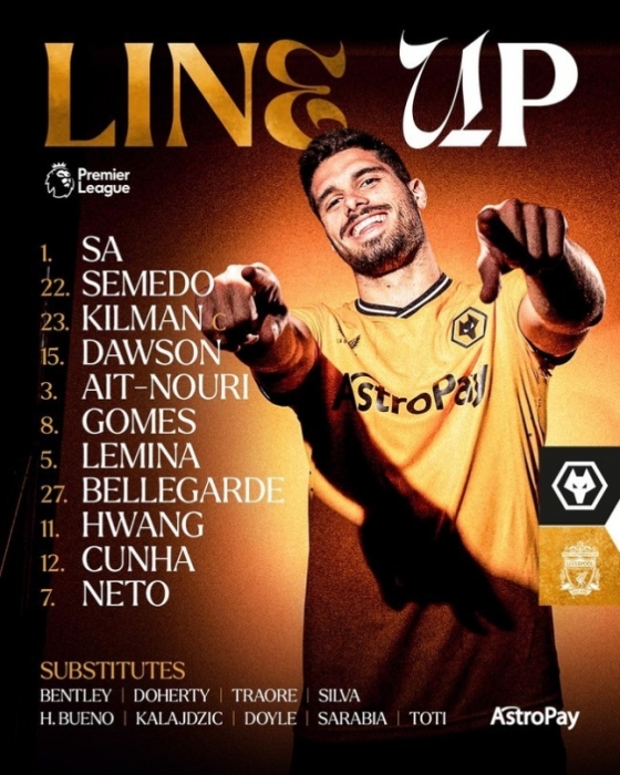 홈팀 울버햄튼은 4-2-3-1 포메이션을 꺼냈다. 최전방에 마테우스 쿠냐를 필두로 2선에 페드로 네투-장리크너 벨레가르드-황희찬이 출격했다. 수비형 미드필더 자리에 마리오 르미나-주앙 고메스가 호흡을 맞췄다. 수비는 라얀 아잇 누리-막시밀리안 킬먼-크레이그 도슨-넬송 세미두로 구성됐다. 골문은 조세 사가 지켰다.