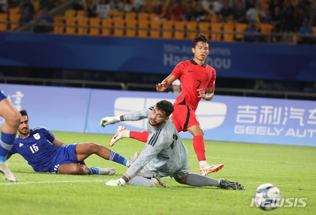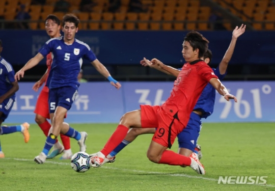 오는 23일 대회 개막을 앞두고 축구 조별리그 일정이 먼저 열렸다. 황선홍 감독은 4-2-3-1 포메이션을 들고 나왔다. 최전방에는 조영욱이 섰고 그 뒤에선 정우영과 엄원상(울산)과 양 측면에, 중앙에 고영준(포항)이 공격형 미드필더와 쉐도 스트라이커 역할을 겸했다.