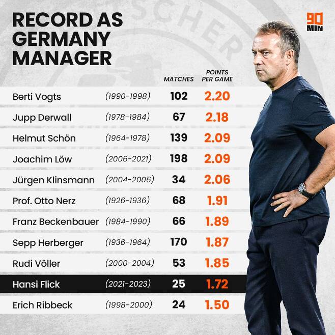플릭 전임 감독은 독일 대표팀 역대 사령탑 순위에서 하위권을 기록했다. 25경기를 치렀는데 경기 당 획득한 점수는 1.72에 불과하다.