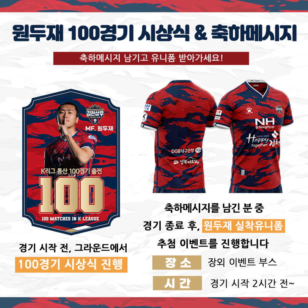 프로통산 100경기 달성자 원두재 관련 이벤트도 준비돼 있다. 경기 전에는 100경기 기념 시상식을 진행하며 MD샵에서는 100경기 기념 친필사인 포토카드 100장을 한정 판매한다. 장외구역에서는 100경기 기념 축하메시지 작성 이벤트를 통해 경기 종료 후 원두재 친필사인 실착 유니폼을 추첨할 예정이다.