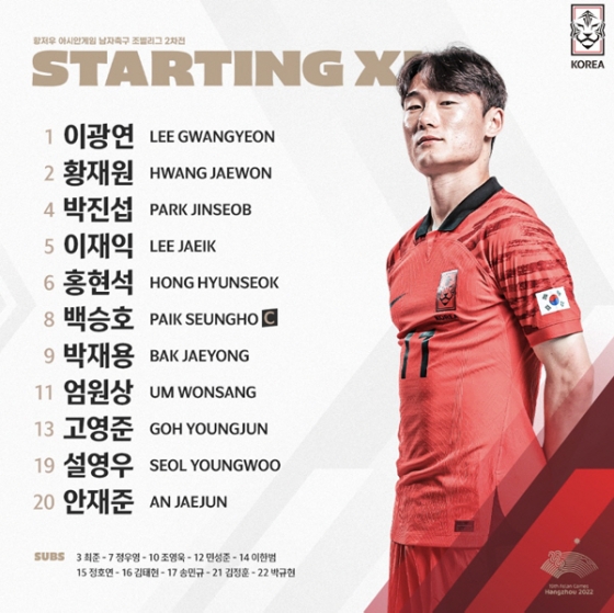 중원엔 주장 백승호와 지난 경기 교체 투입됐던 홍현석이 나선다. 백4는 황재원, 박진섭, 이재익, 설영우가 이루고 골문은 그대로 이광연이 지킨다.