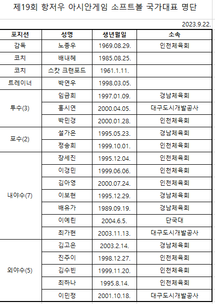 한국 소프트볼 국가대표팀이 오는 26일부터 10일 2일까지 중국 항저우에서 개최되는 제19회 항저우 아시안게임에 출전한다.