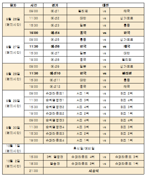 대표팀은 오는 26일 오후 8시(한국시간) 중국과 예선 첫 경기를 시작으로 27일 낮 12시 30분 태국, 28일 낮 12시 30분 필리핀과 예선라운드 경기를 치른다.