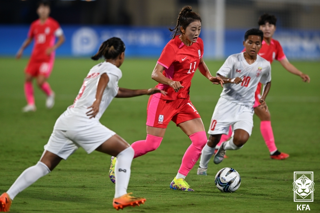 콜린 벨 감독이 이끄는 여자축구 대표팀은 22일(한국시간) 중국 저장성 원저우 스포츠센터 스타디움에서 열린 '2022 항저우 AG' 조별리그 E조 1차전에서 미얀마에 3-0으로 완승했다.