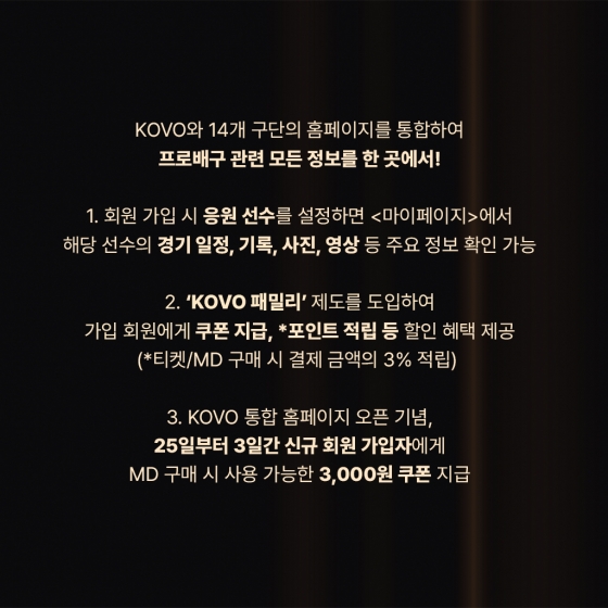 이외에도 'KOVO 패밀리' 제도를 도입해 티켓 및 MD 상품 구매 시 포인트 적립, 할인 쿠폰 지급과 같이 기존엔 없던 다양한 혜택을 마련했으며, 통합 웹사이트·애플리케이션 오픈 기념 이벤트로 25일부터 3일간 신규 회원 가입자 전원에게 MD 상품 구매 시 사용 가능한 3,000원 할인 쿠폰을 각각 지급할 예정이다. 또한 생일인 회원에게는 생일축하 쿠폰을 발송하는 등의 정기적/비정기적 캠페인 또한 함께 진행된다.