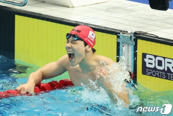 지유찬이 25일 항저우 아시안게임 수영 남자 자유형 50m 결선에서 우승한 뒤 환호하고 있다. 사진=뉴스1