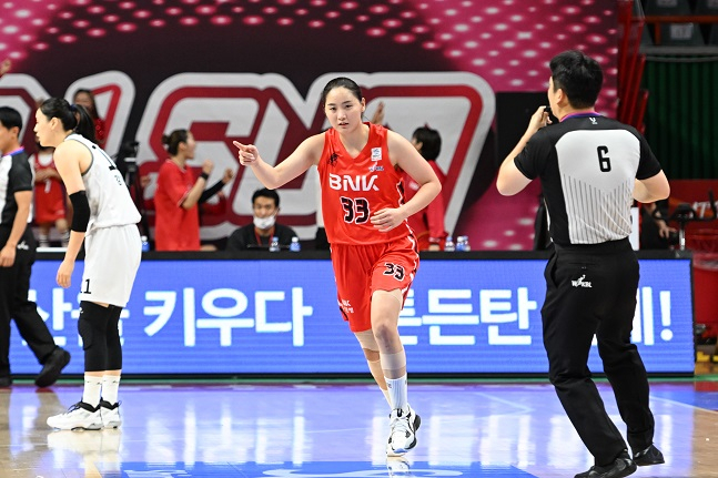 한엄지는 BNK 이적 첫 해인 지난 시즌 30경기에 출전, 평균 29분46초를 뛰며 평균 8.7득점, 5.8리바운드를 기록했다. 비록 개인 기록은 2020 도쿄 올림픽에도 출전했던 2020~21시즌에 미치진 못했지만, 한엄지의 가세로 전력이 강화된 BNK는 성적이 수직 상승했다.