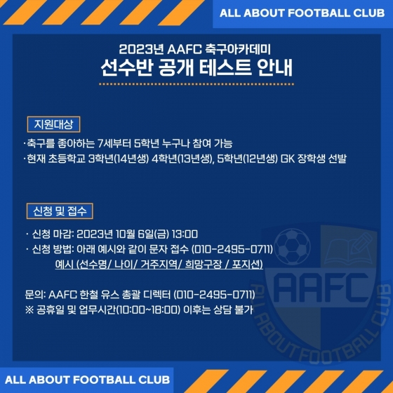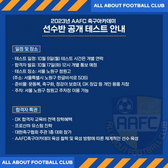 [스포탈코리아] 한재현 기자= '축구의 모든 것'이란 슬로건을 내건 AAFC(All About Football Club)가 선수반 공개 테스트를 실시한다.