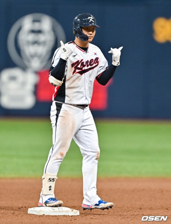 문보경이 26일 서울 고척스카이돔에서 열린 평가전에서 2루타를 치고 세리머니를 하고 있다.