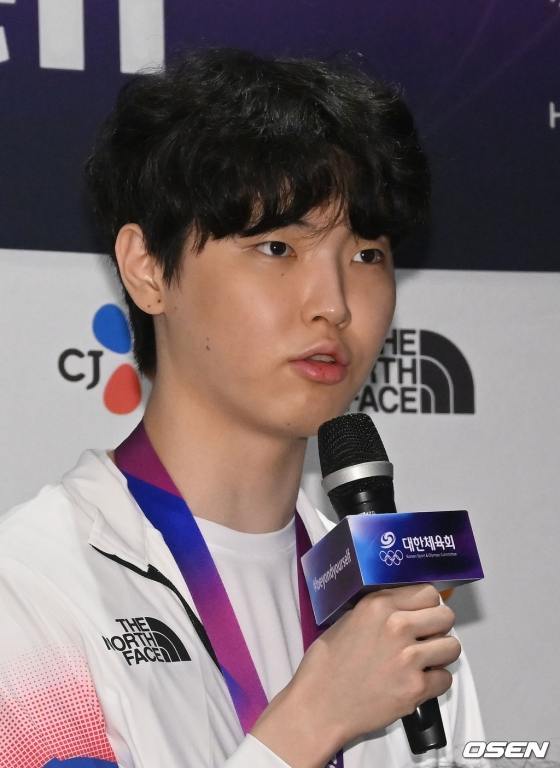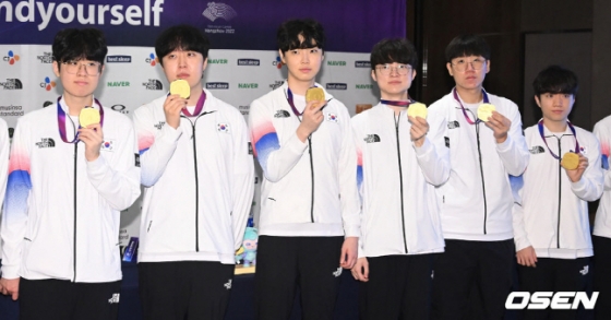 승리의 기쁨을 간직한 대표팀 선수들은 30일 중국 항저우 그랜드 뉴 센추리 호텔 대한체육회 스포츠 외교라운지에서 열린 기자회견에 참석했다. 전날 한반도를 뜨겁게 달군 빅뉴스에 이들에 대한 질문에 쏟아졌다.