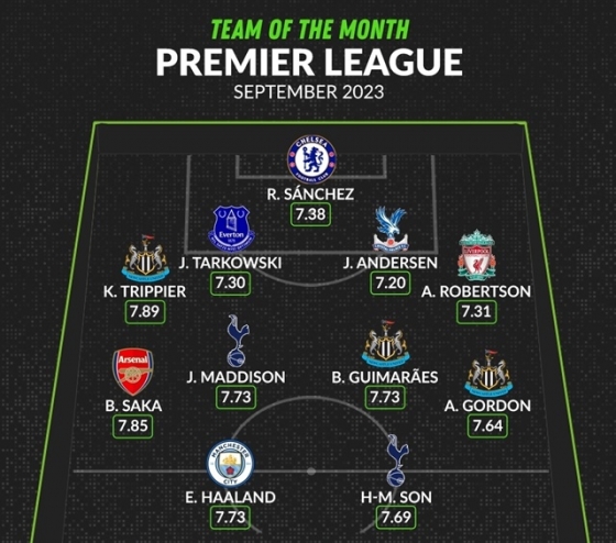 또 부카요 사카(아스널), 브루노 기마랑이스, 앤서니 고든(이상 뉴캐슬)이 미드필더 포지션으로서 9월 베스트11에 선정됐다. 수비수로는 키에런 트리피어(뉴캐슬), 제임스 타코우스키(에버턴) 요하킴 안데르센(크리스탈 팰리스), 앤디 로버트슨(리버풀), 골키퍼로는 로베르트 산체스(첼시)가 포함됐다. 뉴캐슬 선수가 3명으로 가장 많이 뽑혔다.