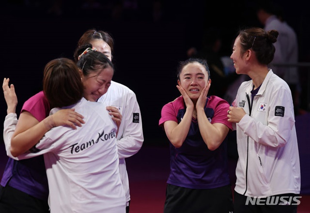 '탁구 레전드' 서효원이 금메달을 이뤄낸 후배들을 위해 꼭 안아줬다. 서효원도 울먹이는 모습이었다. 감동적인 장면이었다.