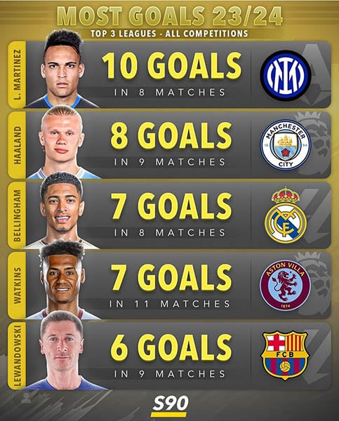 축구 컨텐츠 제작소 ‘score90’은 2일(한국시간) 유럽 3대 리그 공식전 최다 득점자 순위 TOP 5를 공개했다.