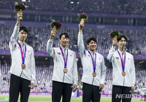 한국은 1986년 서울 대회에서 이 종목 3위에 올랐다. 이후 메달과 인연이 없었지만, 이번 대회 동메달을 획득해 감격적인 순간을 맞았다. 금메달은 중국(38초29), 은메달은 일본(38초44)이 가져갔다.