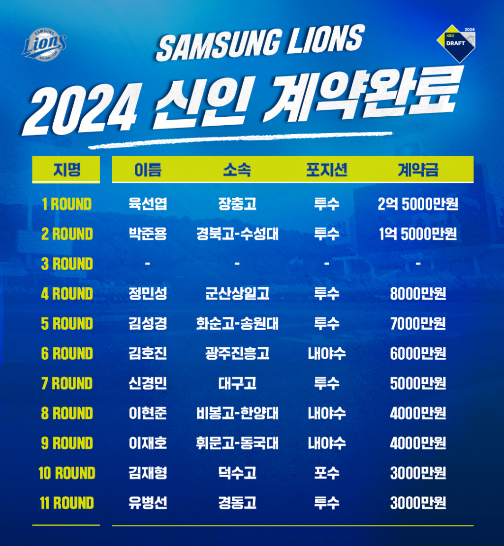 삼성 라이온즈는 4일 "2024 신인 드래프트 1라운드 전체 3순위로 지명한 육선엽(장충고)과 계약금 2억5000만원에 계약했다"고 밝혔다.