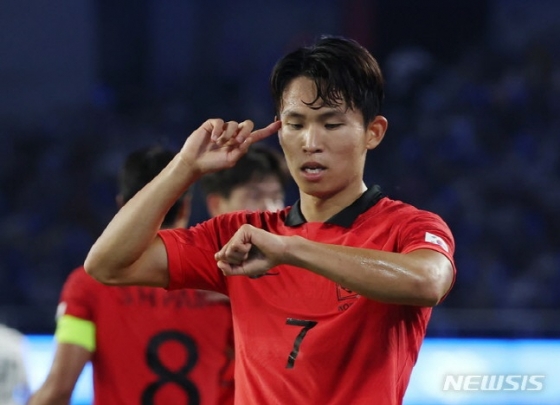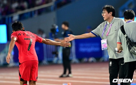 황선홍 감독은 후반 13분 교체 카드를 꺼내들었다. 이강인과 정우영을 빼고 송민규와 정호연을 투입했다. 대회 직전 허벅지 부상을 당했던 이강인은 이날 대회 들어 가장 많은 시간을 뛰었다. 결승전을 앞두고 무리시키지 않겠다는 복안으로 해석할 수 있었다. 정우영 또한 마찬가지.