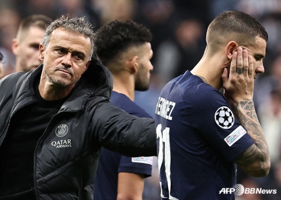 충격적인 대패에 루이스 엔리케 PSG 감독(왼쪽)이 선수들을 위로하고 있다. /AFPBBNews=뉴스1