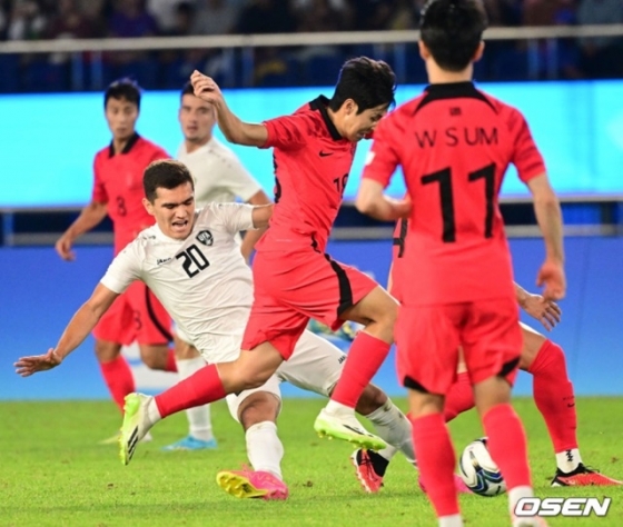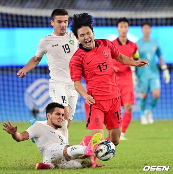 한국 선수들이 수차례 쓰러졌다. 우즈베키스탄의 비매너 축구 때문이었다. 공이 아닌 한국 선수들을 향해 태클이 들어갔다. 결국 엄원상이 부상을 당했다.