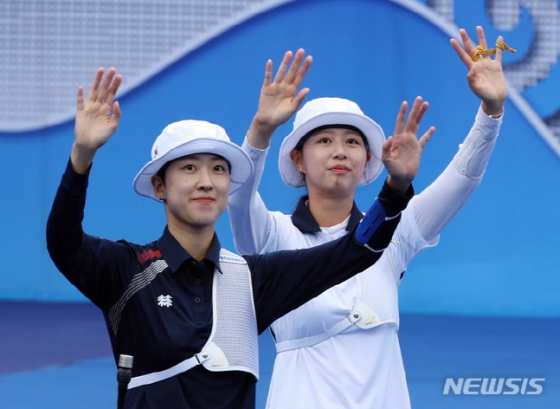 앞서 임시현은 1일 예선라운드에서 678점을 쏴 전체 1위에 등극해 혼성전 진출 자격도 얻었다. 이우석(26·코오롱)과 나선 혼성전과 예선 3위 안산, 4위 최미선(27·광주은행)과 함께 출전한 여자 단체전에서도 금메달을 목에 걸었다.