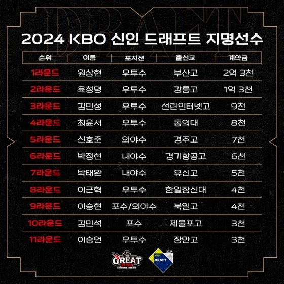 KT는 7일 "2024년 신인 지명 선수들과 입단 계약을 완료했다"고 밝혔다. KT는 지난달 14일 열린 2024 KBO 신인드래프트에서 총 11명의 선수(투수 6명, 포수 2명, 내야수 2명, 외야수 1명)를 지명했다.
