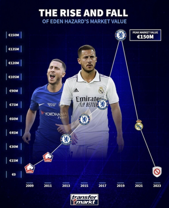 아자르의 은퇴 선언 이후 축구선수의 가치를 전문적으로 다루는 ‘트랜스퍼마크트’는 아자르의 몸값 그래프를 공개했다. 그래프에 따르면 아자르는 첼시 시절 최고점을 찍은 뒤 레알 마드리드 이적 후 몸값이 폭락했다.