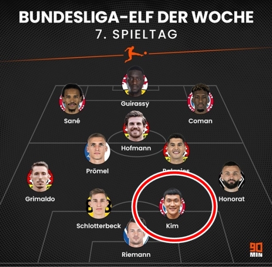 현지도 칭찬을 쏟아냈다. 김민재는 주요 매체들이 선정한 주간 베스트11을 싹쓸이 했다. 먼저 김민재는 축구전문매체 90MIN가 선정한 분데스리가 7라운드 베스트11에 들어갔다. 4-2-3-1 포메이션이었고, 김민재가 센터백 한 자리를 꿰찼다. 김민재는 도르트문트의 센터백 니코 슐로터베크와 짝을 이뤘다.