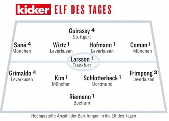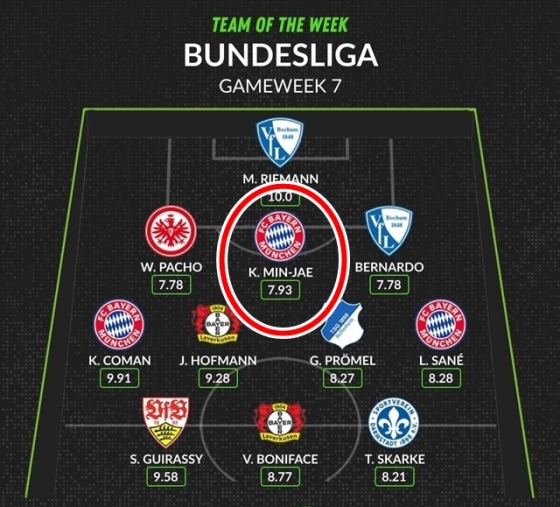 또 김민재는 축구통계사이트 후스코어드닷컴이 뽑은 베스트11에도 이름을 올렸다. 포지션별로 7라운드에서 가장 높은 평점을 기록한 선수 11명으로 3-4-3 포메이션을 구성했다. 김민재는 평점 7.93을 받았다. 리그 전체 수비수 중 가장 높은 평점이었다. 센터백 윌리안 파코(프랑크푸르트), 베르나르도(보훔)가 평점 7.78을 받아 김민재와 베스트11을 함께 했다.